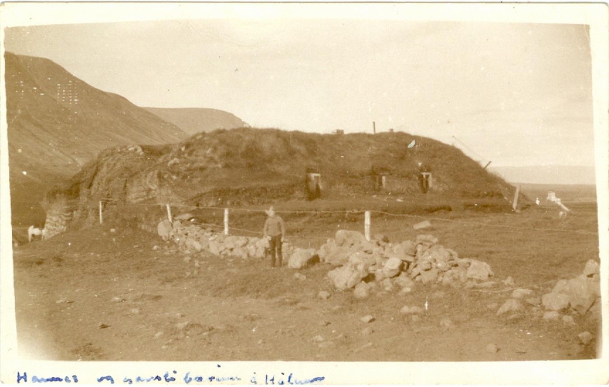Í forgrunni stendur strákur við hálfhruninn grjótgarð, í baksýn er bakhlið torfbæjar. Undir myndinni stendur skrifað: Hannes og gamli bærinn á Hólum.