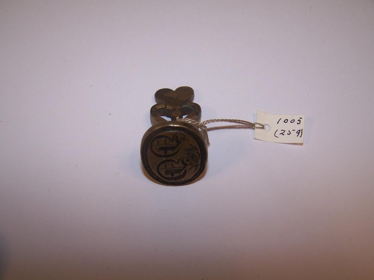 Signet úr kopar, sporöskjulaga 2.2. x 2.7 cm. Fangamark, gotneskir stafir: G.G. = Gísli Gíslason (Skarða Gísli).