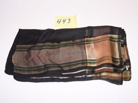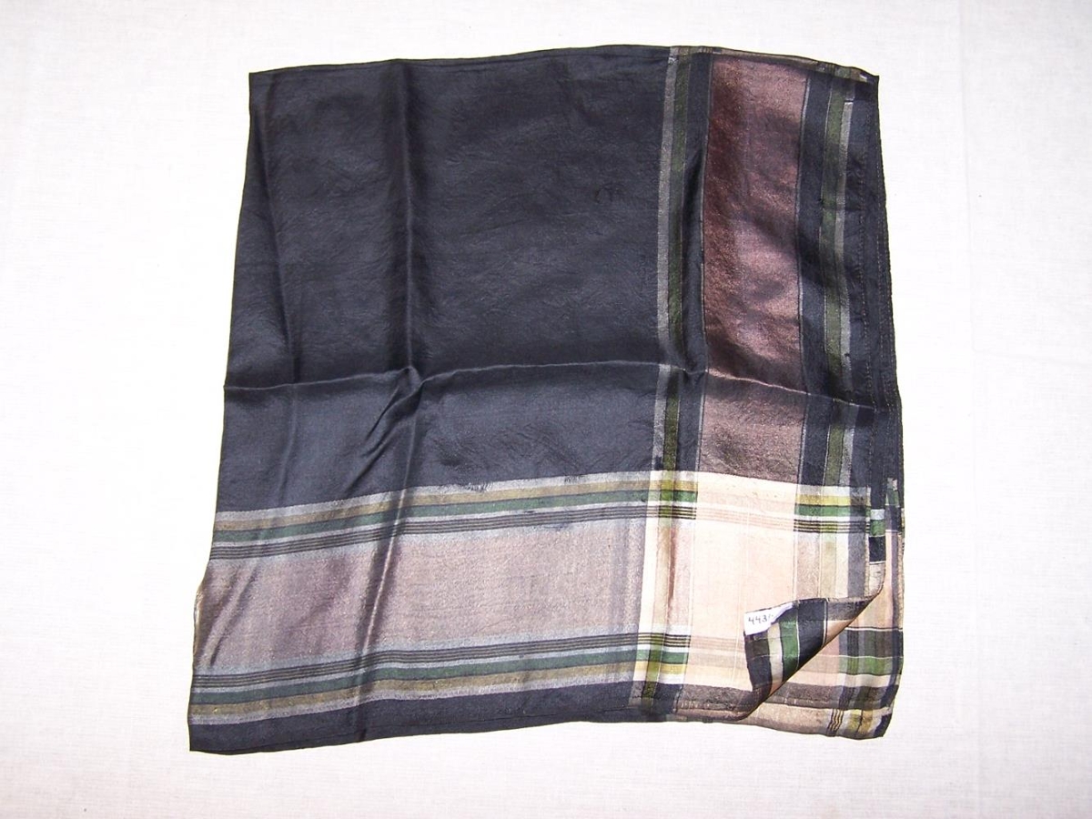 Silkiklútur. Stærð: 70 x 69 cm. Svartur með bleikrauðum breiðum bekk í kring og nokkrum mjóum svörtum, grænum og gráum. keyptur 1846 og gefinn í fermingargjöf Maríu Þorsteinsdóttur frá Steindyrum í Grýtubakkahreppi. Hún var amma gefandans, Maríu Jónasdóttur, og hafði hún gefið henni báða klútana nr. 442 og 443.