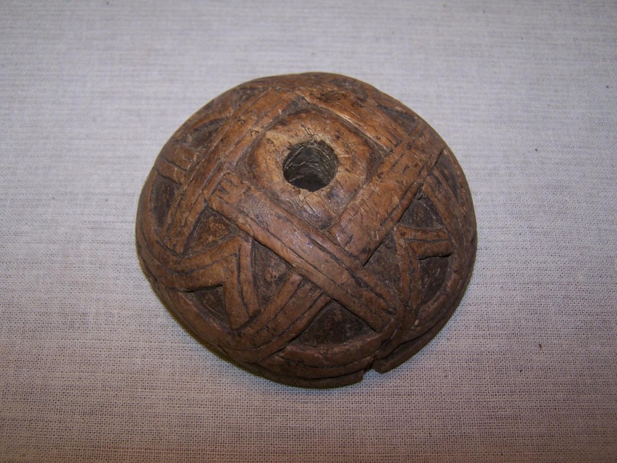 Snældursnúður. Þvermál 8 cm. Kúptur og útskorinn. Neðan á snúðnum ANNO 1862.