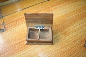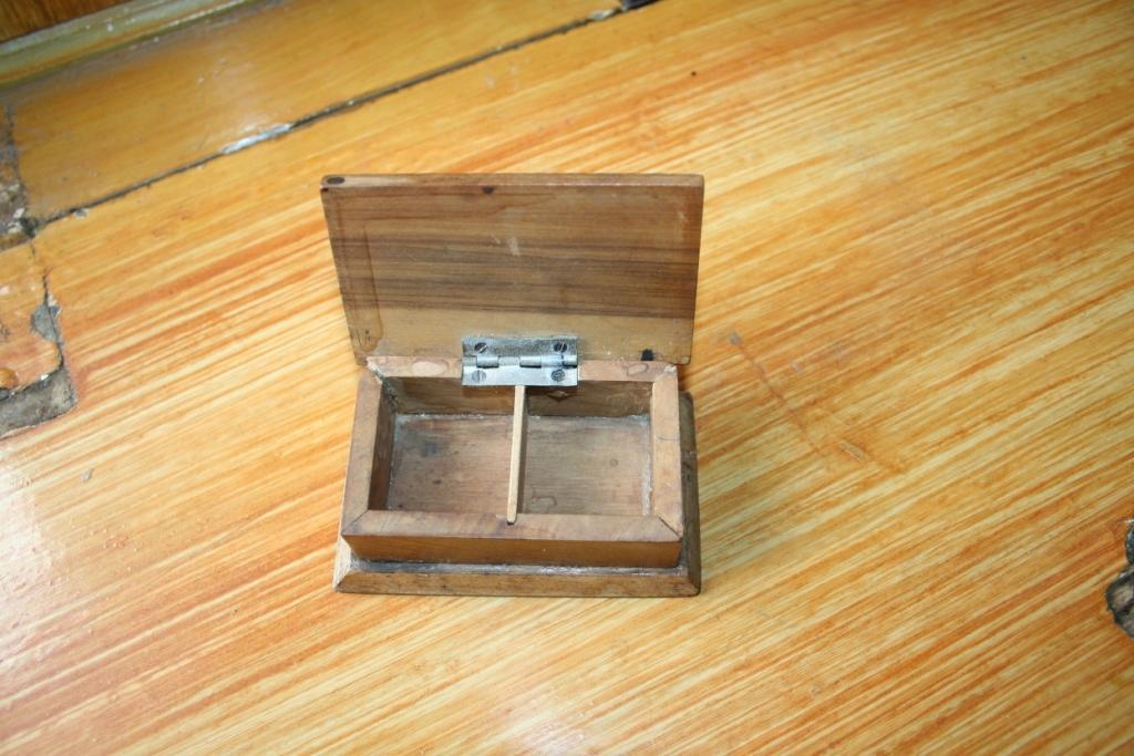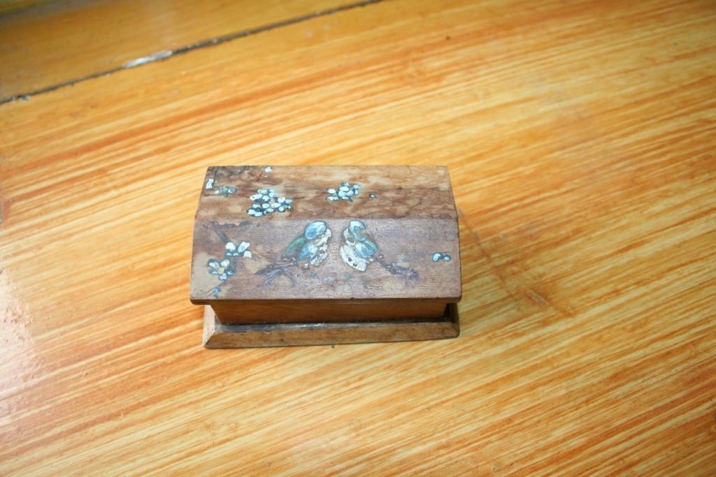 Frímerkjastokkur úr viði, tvíhólfa. Hjör á loki. Lokið með fugla- og blómamyndum.