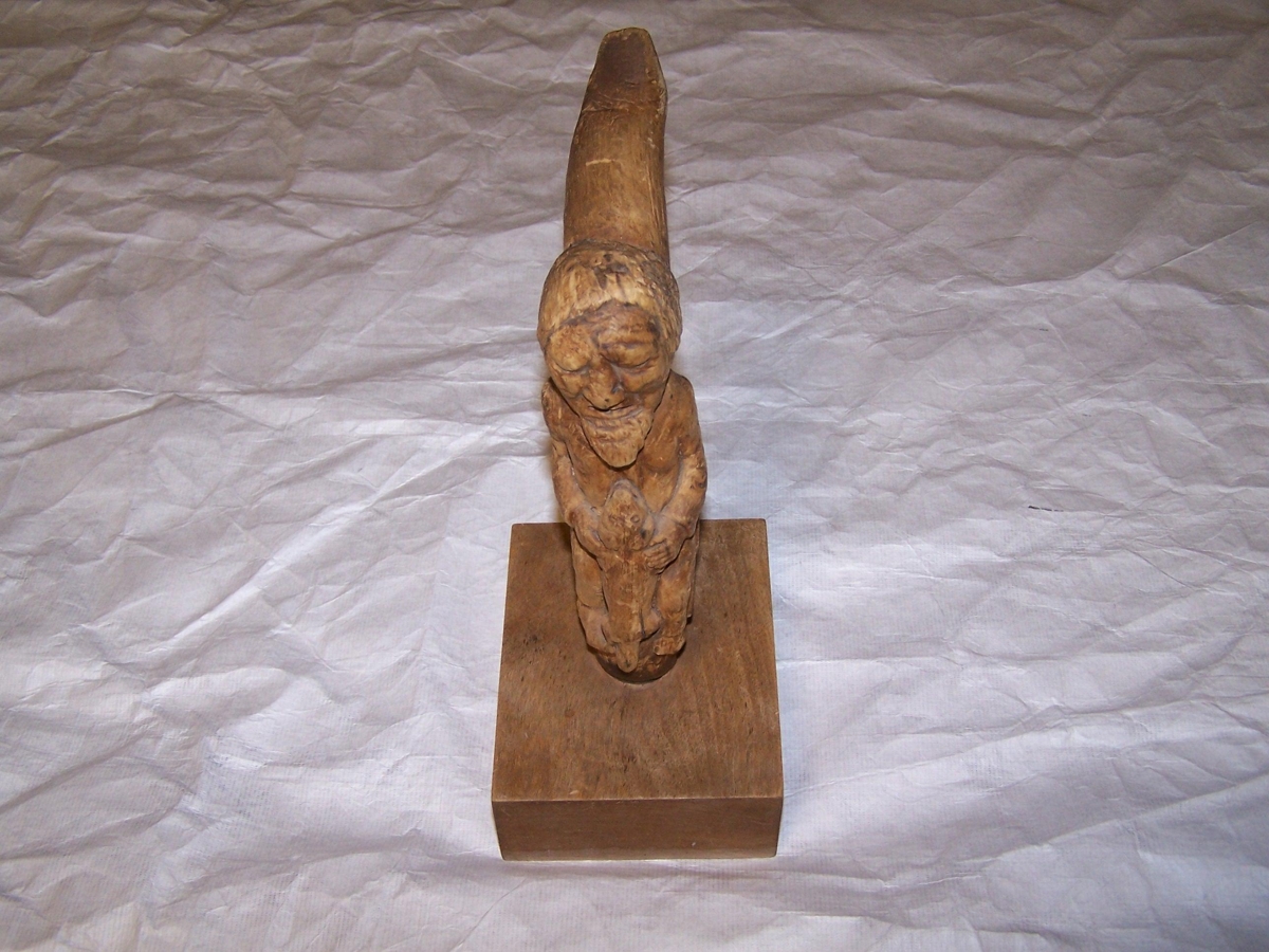 Handfang eða húnn af göngustaf. Upphaflega var allur stafurinn, gerður úr rekaviði en handfangið brotnaði af. Tálgaður þannig til að maður með húfu situr á stól en hundur flaðrar upp um hann. Eftir að stafurinn brotnaði var Jóhann Björnsson myndskurðarmeistari frá Húsavík, fenginn til að breyta honum í "bréfapressu", þ.e. hann setti stétt undir handfangið. Kemur úr búi Júlíusar Sigfússonar bátasmiðs og konu hans Helgu Eggertsdóttur. Gef. Sveinn og Kristján Júlíussynir og Jóhann Helgason mágur þeirra.