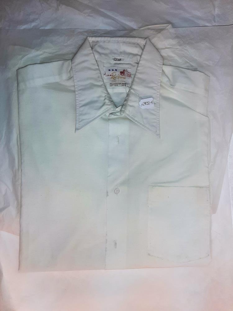Skyrta. Spariföt Jóns Marteinssonar bónda á Bjarnarstöðum í Bárðardal. Jakki, buxur, vesti, skyrta og bindi. Skyrtan er merkt með miða sem á stendur "Dísa" en það var gælunafn Vigdísar Jónsdóttur, konu Jóns.