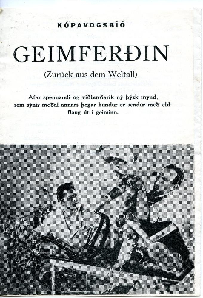 Kvikmyndaprógram fyrir kvikmyndina „Geimferðin“ (Zurück aus dem Weltall). Kópavogsbíó. Bæklingur í svart/hvítu.