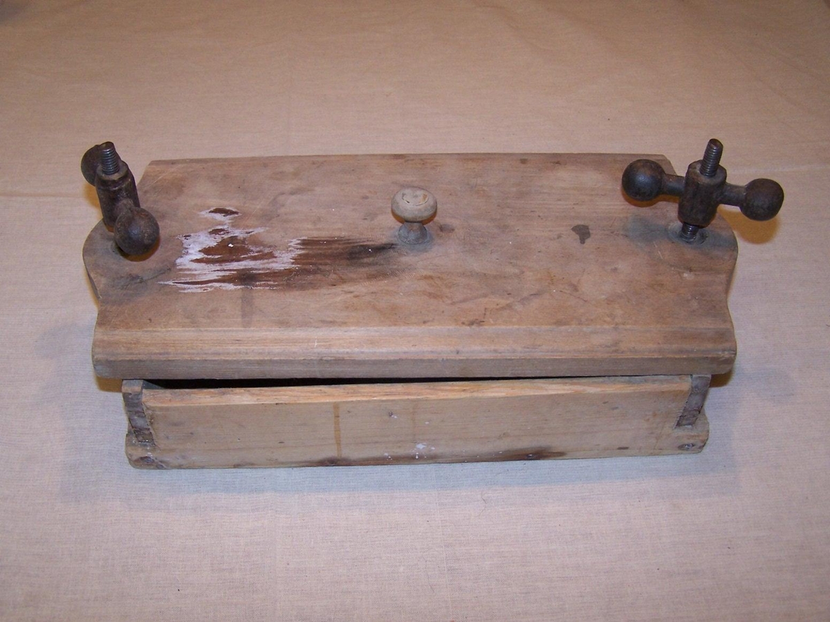 Rúllupylsupressa, upphaflega frá Stefáni og Kristínu Guðjohnsen. Gáfu hana Benedikt Jóhannssyni og Hólmfríði Jónsdóttur í Grafarbakka á Húsavík.