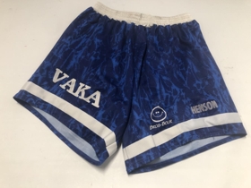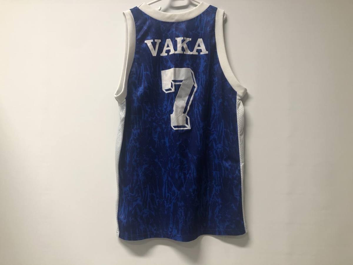 Körfuboltabúningur, stuttbuxur og bolur. Blár og hvítur. Merktur Vöku á bakhlið og á buxnaskálm. Auglýsingar m.a. frá Sportbæ, MS og Kvistfelli.