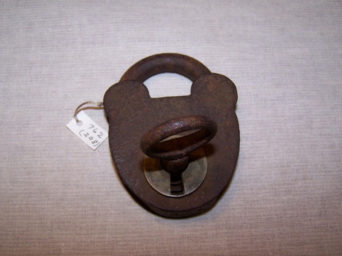 Hengilás með skildi. L. 9 cm, br. 6.5 cm. Er úr járni með messingslaufi kringum skráargatið. Í nothæfu ástandi (1959). Úr dánarbúi K.J.