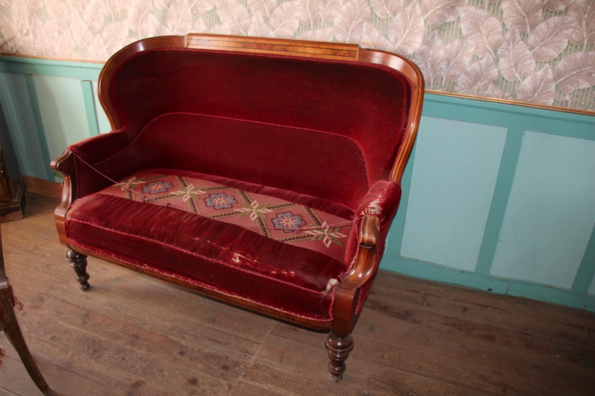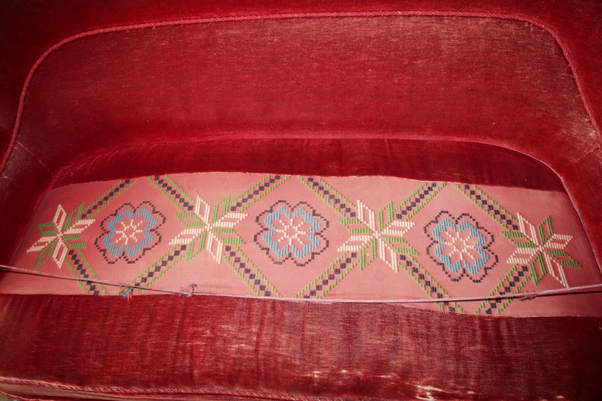 Bekkurinn úr harðviði, fóðraður með rauðu flaueli, en breiður, glitsauamaður bekkur felldur inn í setuna að endilöngu.