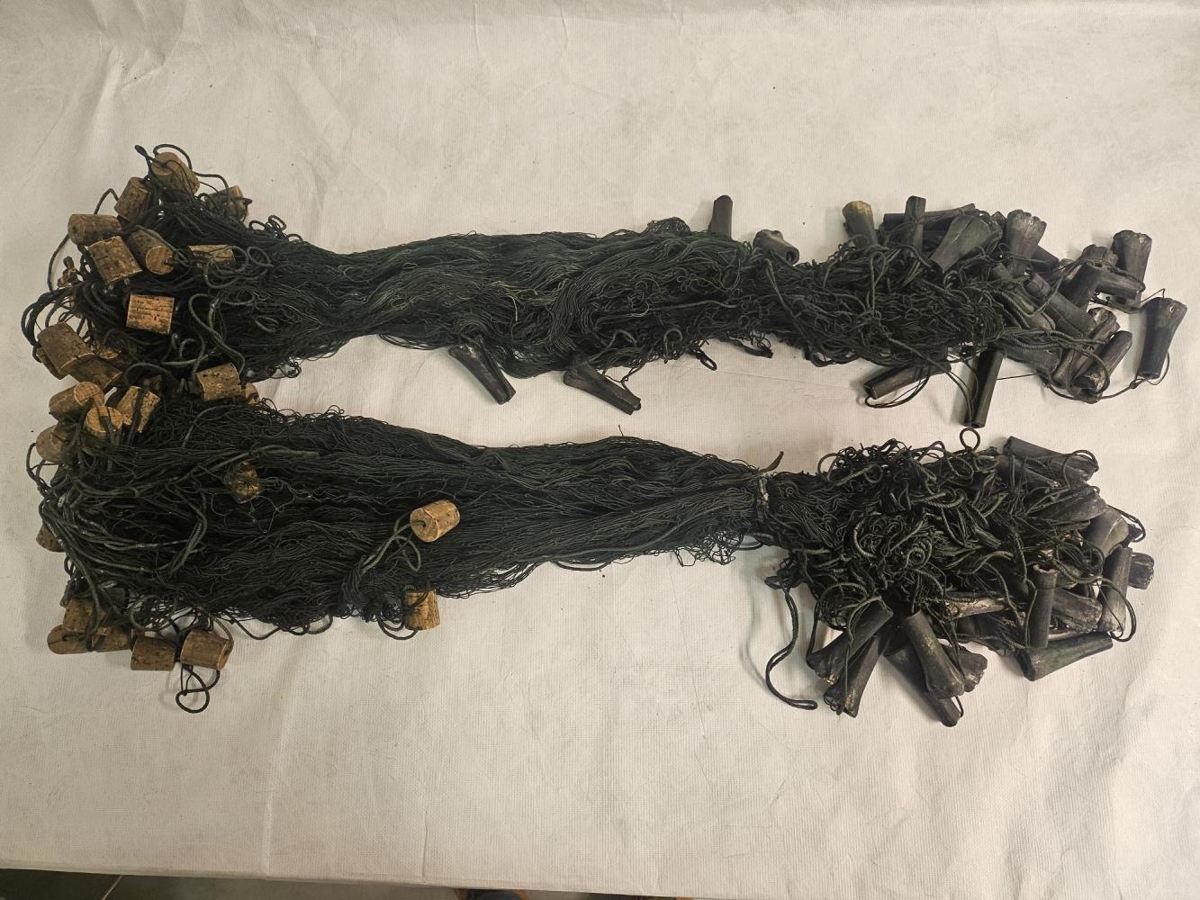 Silunganet, 2 stk. úr grönnu hampgarni. Korktappar á efri þinul en sauðarleggir á neðri. Netin lituð dökkum lit.
