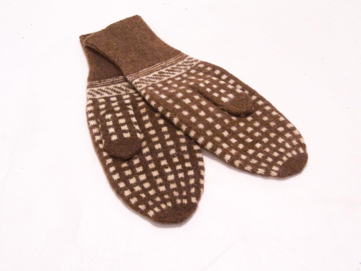 Karlmannavettlingar, tvíbandaðir. Spunnið úr íslensku þeli. Sauðsvart og hvítt.