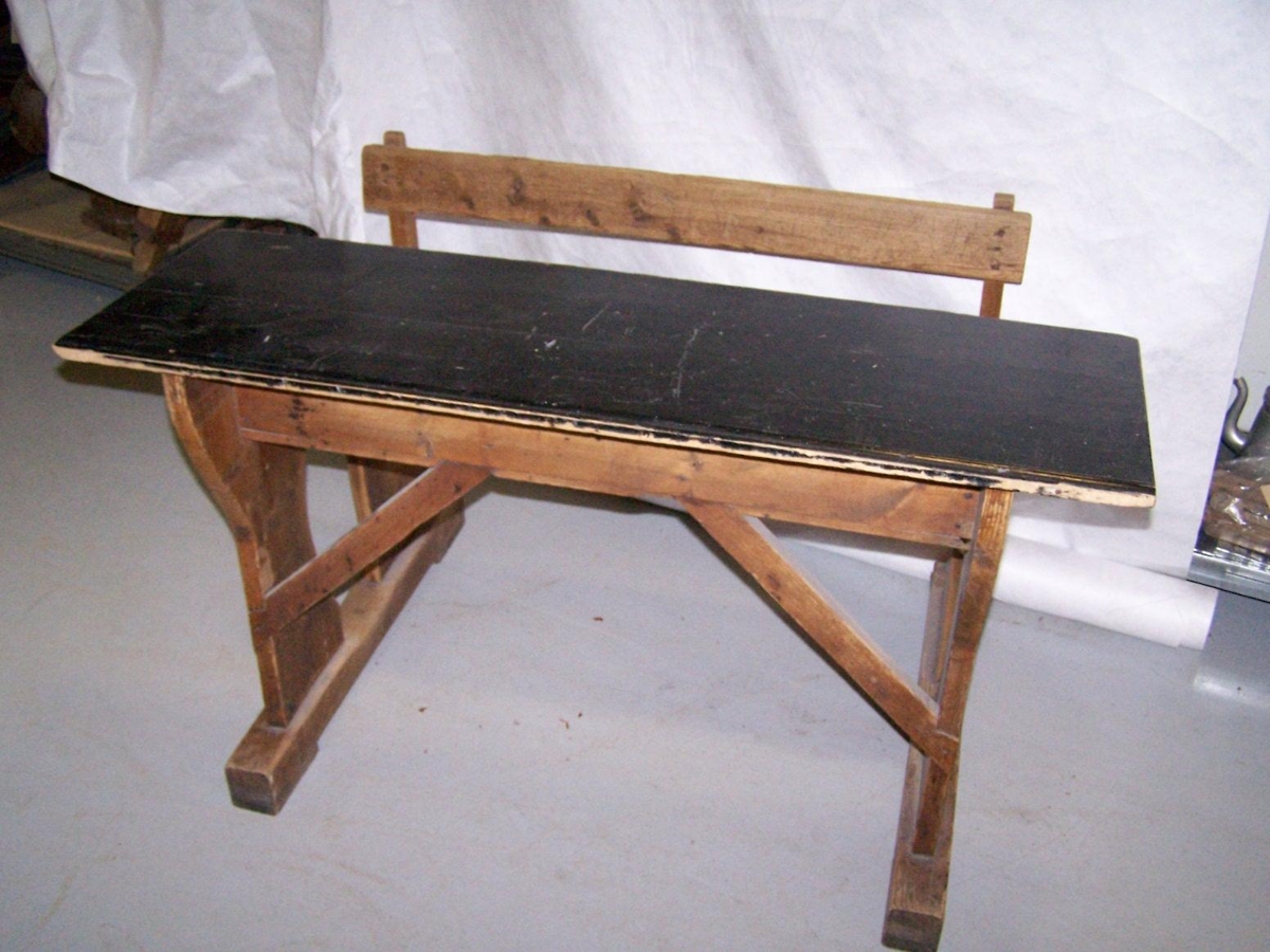 Barnaskólabekkur úr gamla Barnaskóla Húsavíkur sem opnaður var 1908. Ætlaður fyrir 2 nemendur hver eining. Tveir svona bekkir afhentir. Sambyggt borð og bekkur úr viði, bekkurinn er með baki (skólaborð) undir borðinu er hilla. Borðplata er 115x39,5 cm setan á bekknum er 94x22 cm