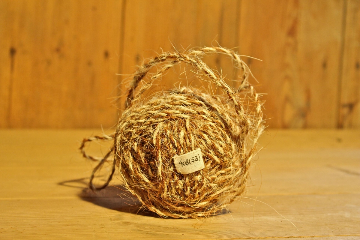 Hrosshárshnykill, sýnishorn. Tvinnaður: bleikt og hvítt. Spunnið af Albert Vigfússyni.