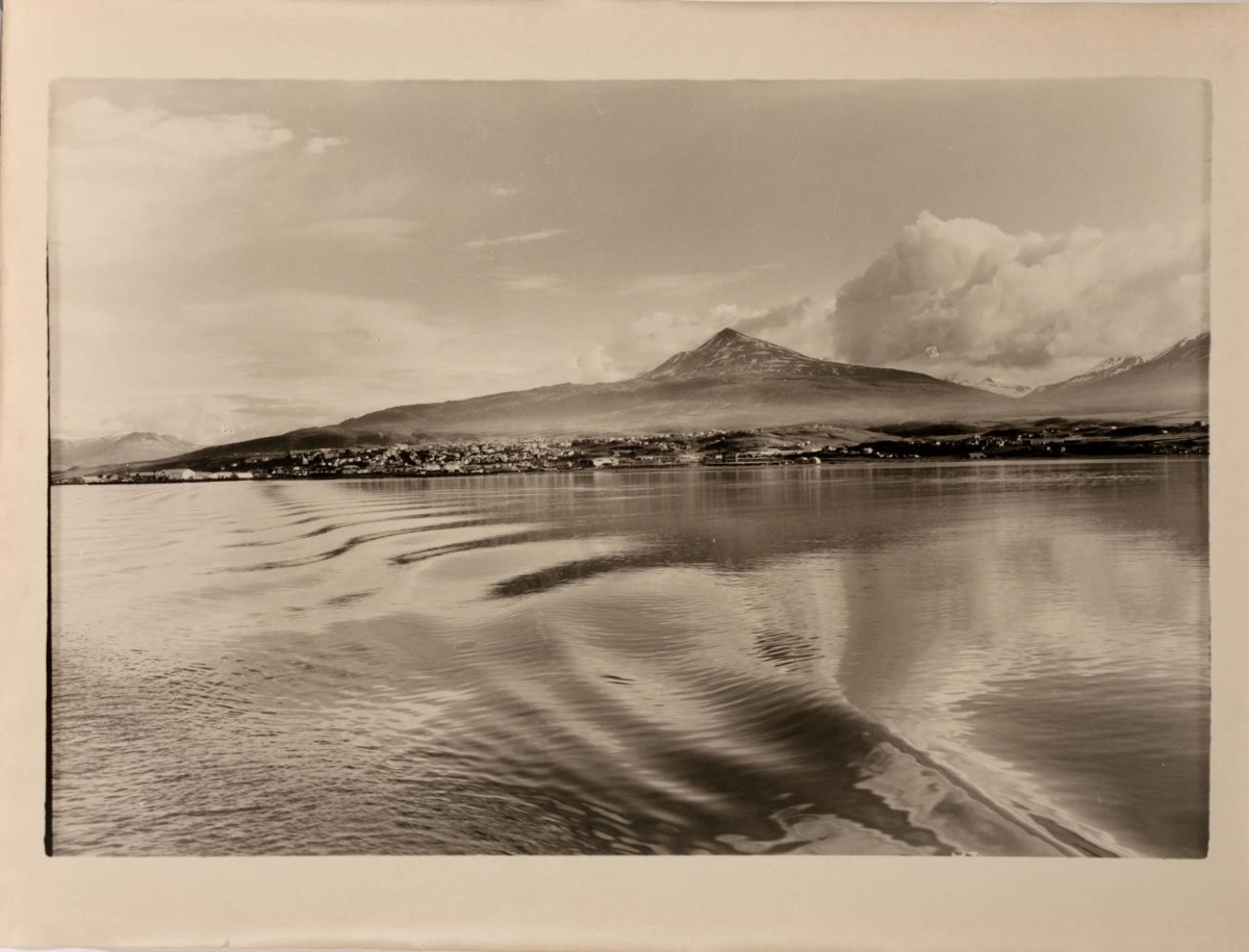Sléttur sjór á firði og horft eftir kjölfari. Í fjarska er þéttbýlisbyggð undir fjalli.