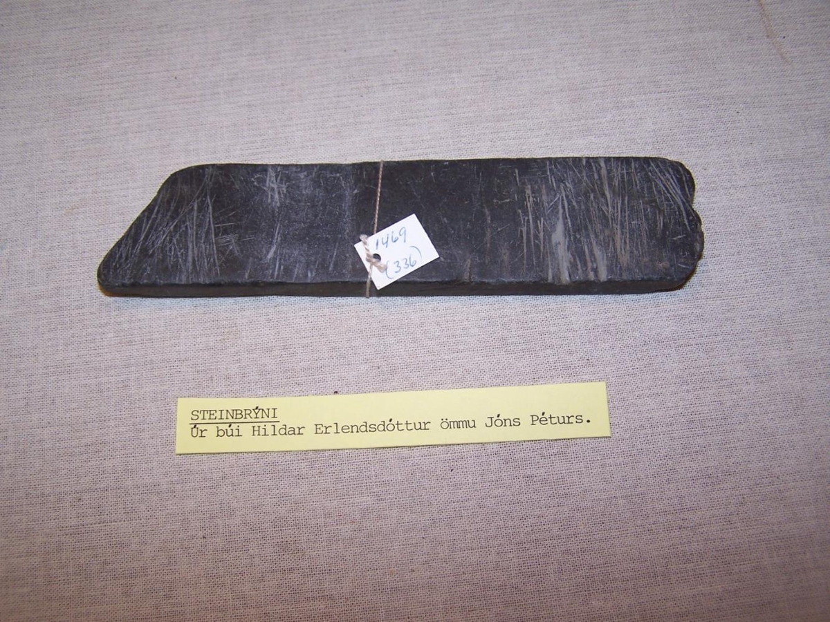 Brýni Jóns Péturssonar. Notað það til að brýna rakhnífinn sinn. Er úr búi Þórhöllu Sigurðardóttur og Jóns Péturssonar, Álfhól, Húsavík.