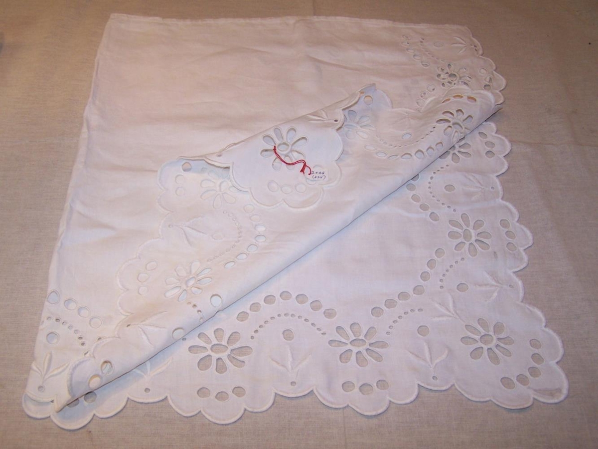 Kommóðudúkur, hvítur með enskum og frönskum saum gerður af Málfríði Jónsdóttur frá Klömbur í Aðaldal, síðar húsmóðir á Húsavík, gift Hallsteini Karlssyni.