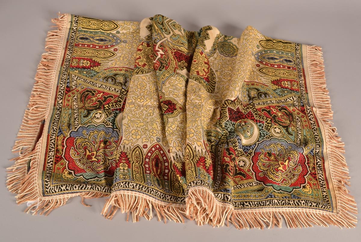 Ljós borðdúkur með gulu, rauðu, grænu og bláu mynstri. Dúkurinn var settur sem sparidúkur á borðstofuborð (BYR2019-7)