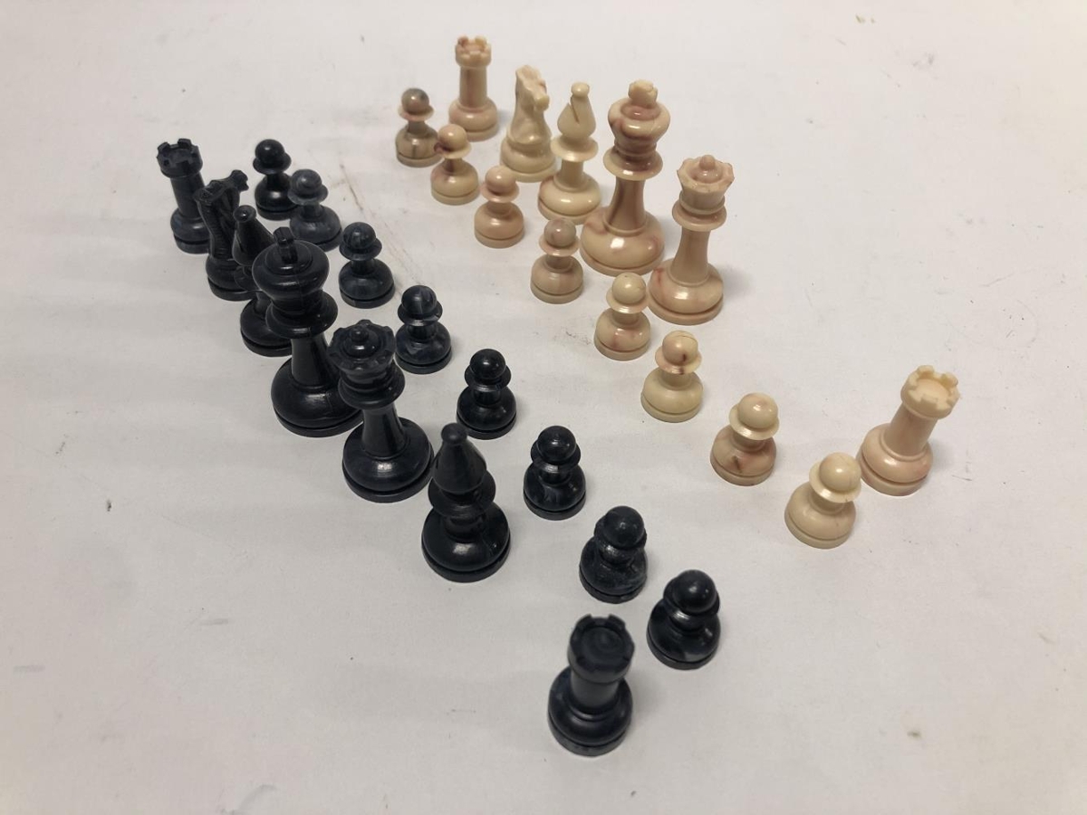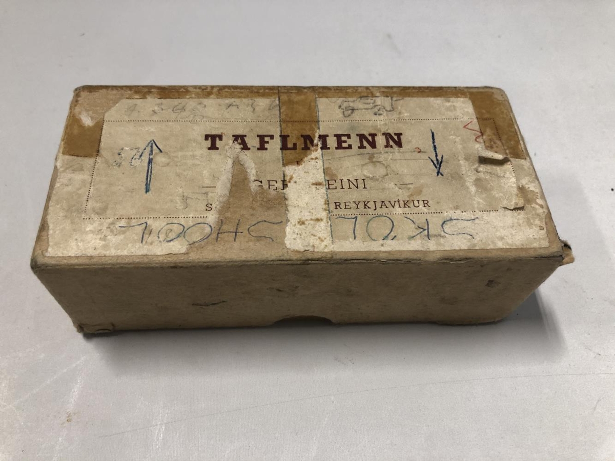 Taflmenn úr plasti, frekar litlir. Vantar hvítan og svartan riddara og hvítan biskup. Varðveittir í pappaöskju. Pappaaskjan er nokkuð lúin og með kroti, stærð öskjunnar; L:14,5. B:7. H:4,5.