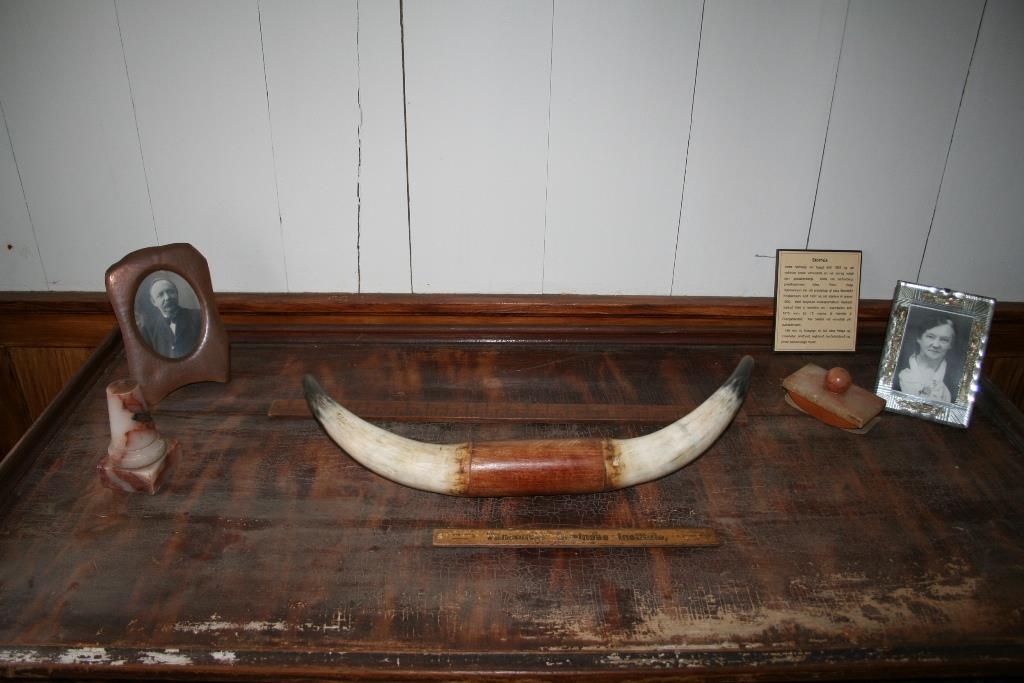 Kýrhorn. Tvö, samsett notuð sem snagar. - Úr fórum séra Péturs Helga Hjálmarssonar.