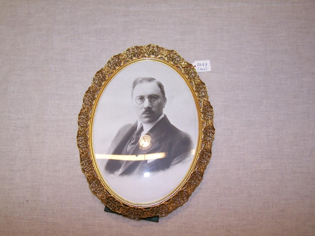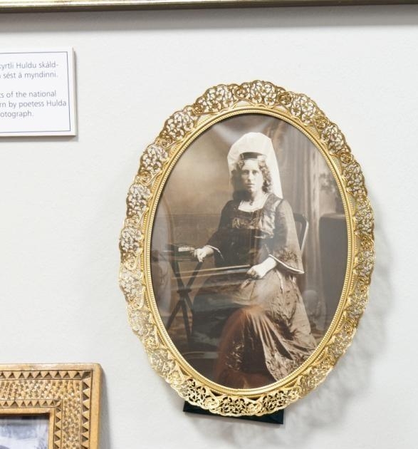 Innrammaðar ljósmyndir af Unni Benediktsdóttur Bjarklind (Huldu skáldkonu) og eiginmanni hennar, Sigurði Sigfússyni Bjarklind kaupfélagsstjóra á Húsavík. Rammi verið skreyttur af sama gullsmið og gekk frá stokkabelti og ennisspöng 1927.