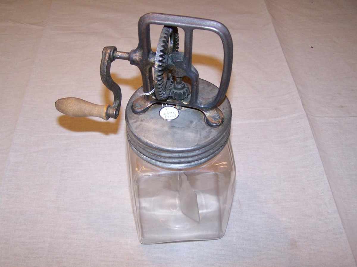 Lítill tréstrokkur í glerskál, ætlaður til heimilisnota.