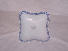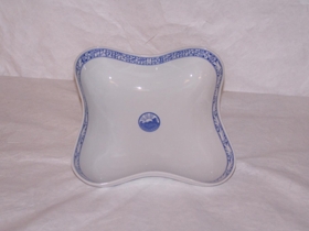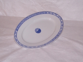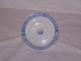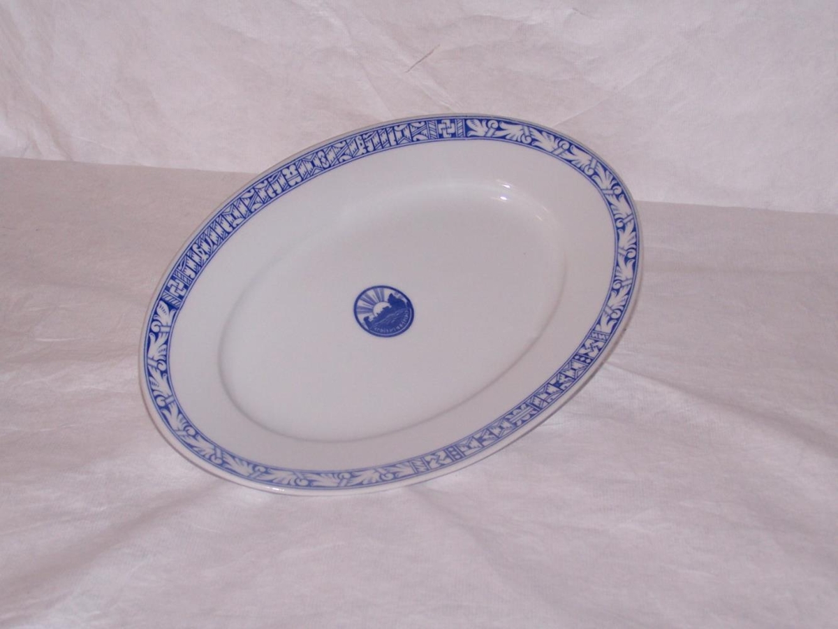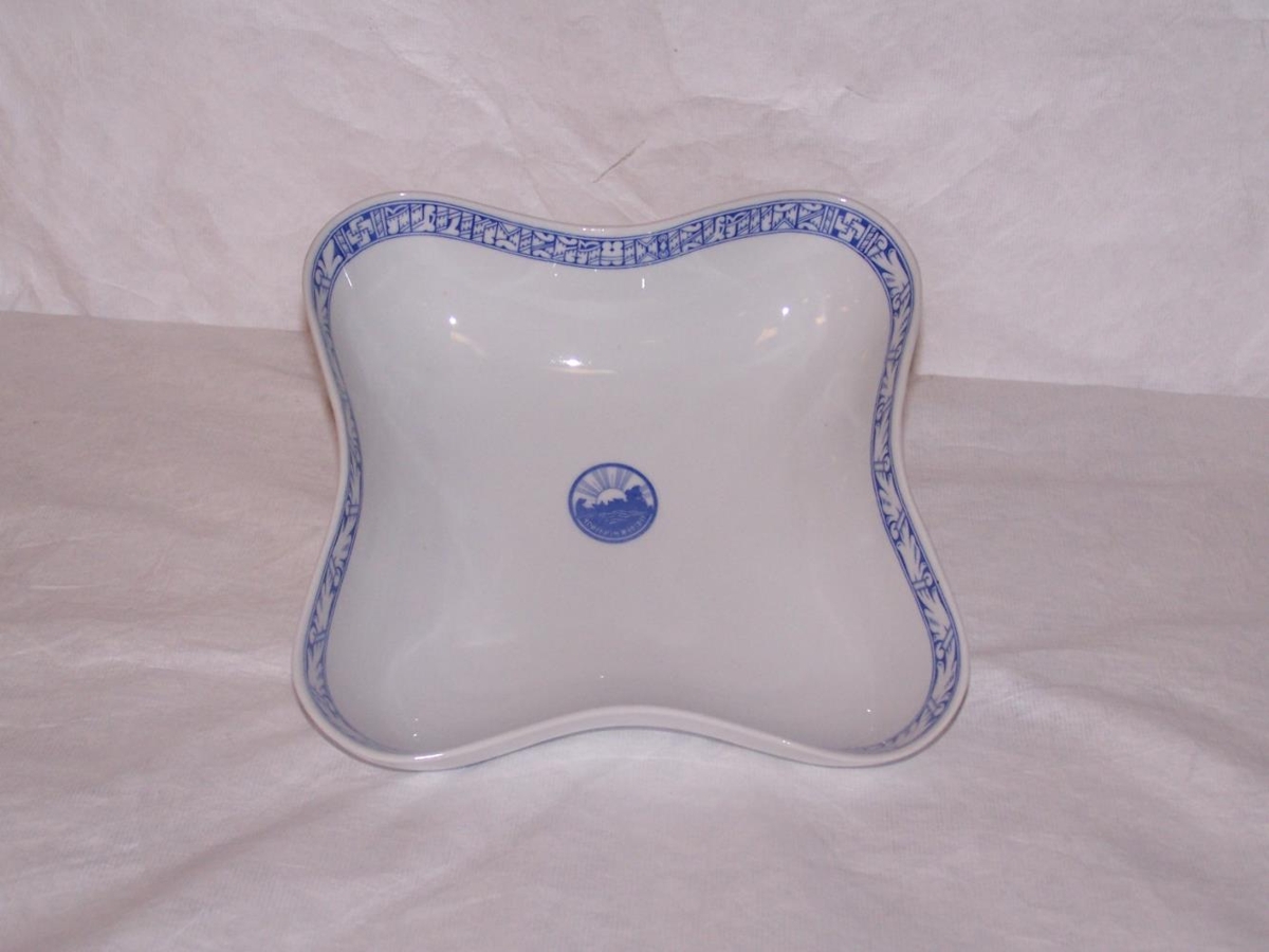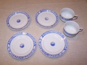 Kaffistell (hluti) með hvítri og blárri skreytingu og merki Alþingishátíðarinnar 1930. Alls 11 hlutir.
