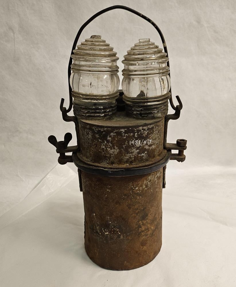 Skipslugt. 12,5 cm í þvermál. 2 glerperur. 'MADE IN GRIMSBY. PATENT No. 31477/40?