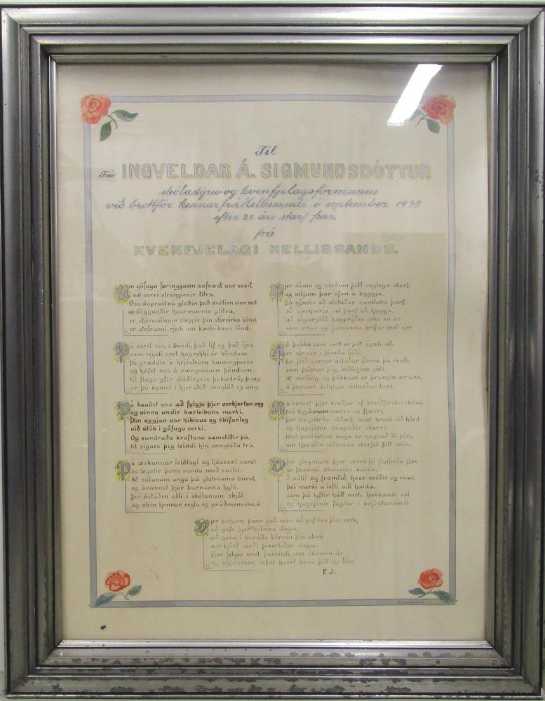 Innrammað kveðjuljóð til Ingveldar Ástrósar Sigmundsdóttur frá Kvenfélagi Hellissands. Ljóðið er níu erindi og undirritað F. J.. Það er undir gleri og í 7 cm breiðum gráum ramma. Yfirskriftin er: Til Ingveldar Á. Sigmundsdóttur skólastýru og kvenfélagsformanns við brottför hennar frá Hellissandi í september 1935 eftir 21 árs starf þar. Frá Kvenfélagi Hellissands.
