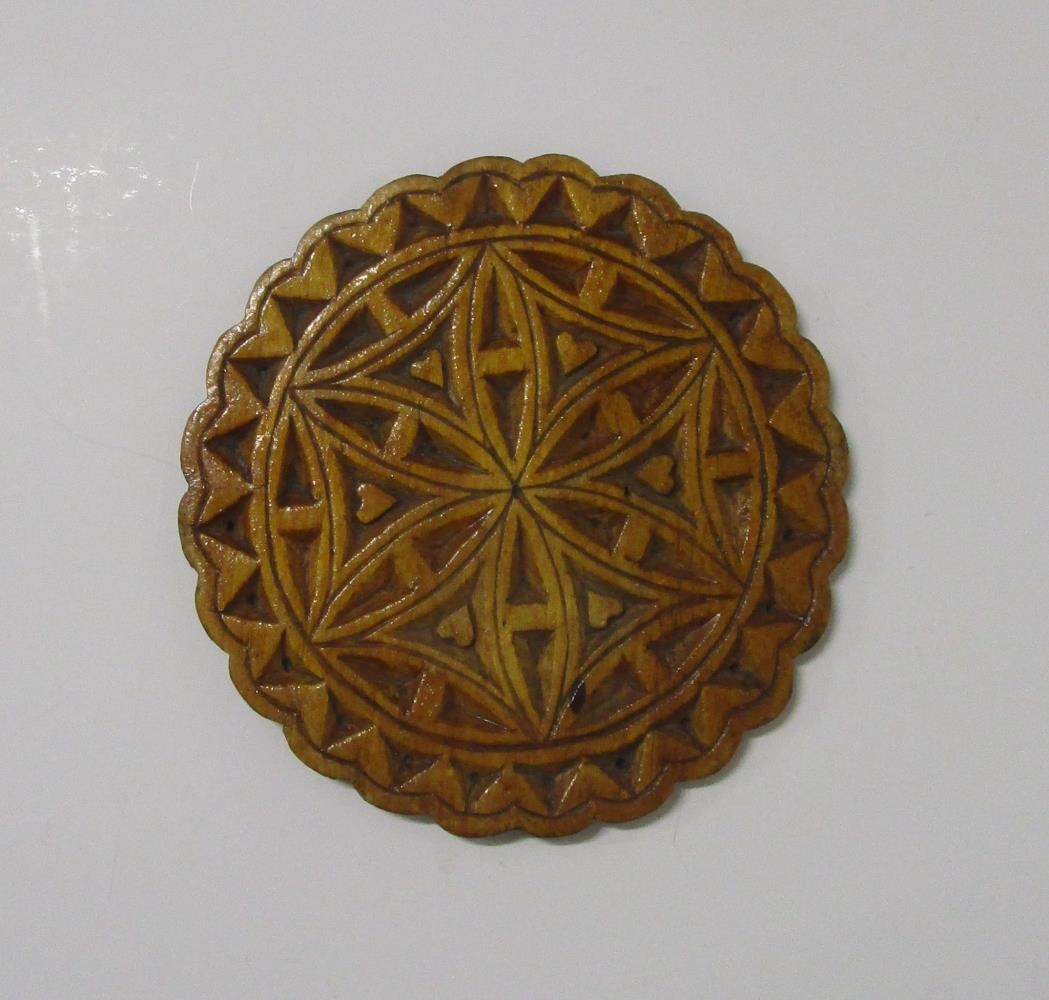 Kringlóttur útskorinn skjöldur. Ingveldur Ástrós Sigmundsdóttir og sonur hennar Sigmundur Magnús lærðu bæði útskurð og ekki er vitað hvort þeirra skar skjöldinn út.