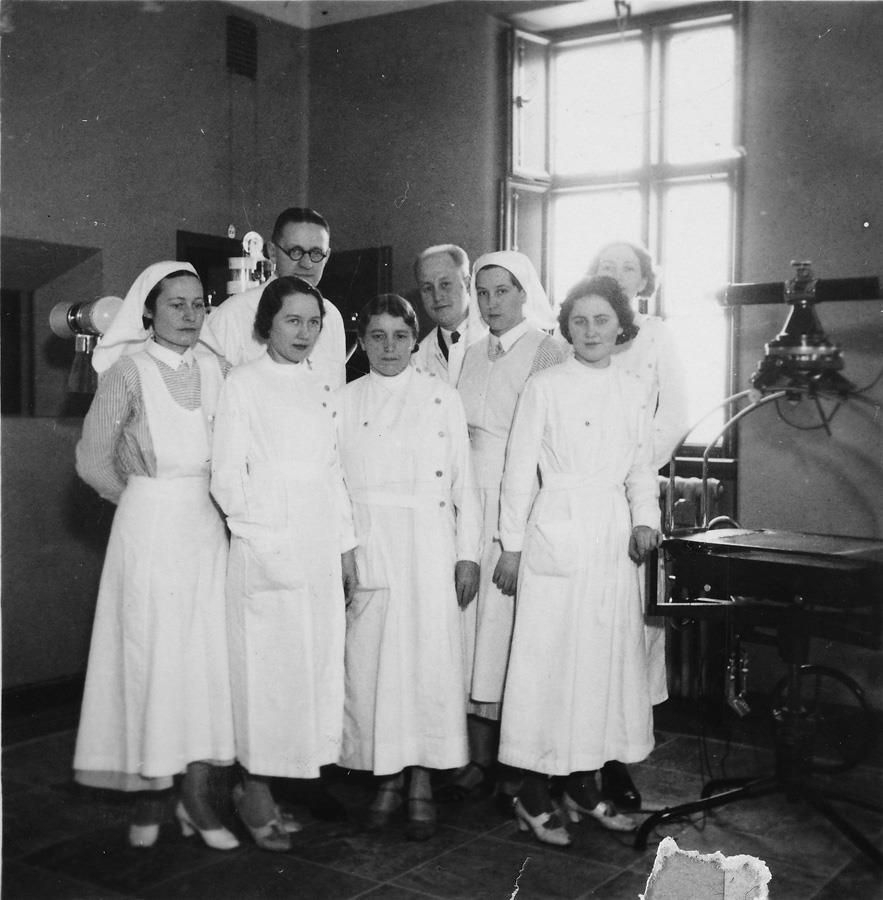 Á Röntgendeild Landspítalans. Gunnlaugur Claessen læknir er í aftari röðinni til vinstri og Auður Sveinsdóttir stendur fremst til hægri. Önnur nöfn vantar.