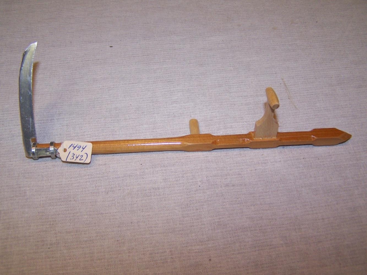 Orf með hælum (karl og kerling) og hólkum, ásamt eylandsljá. Nákvæm eftirlíking af venjulegu orfi. Lengd 20 cm. Smíðað af Jóni Sigurgeirssyni frá Helluvaði, búsettur á Akureyri.
