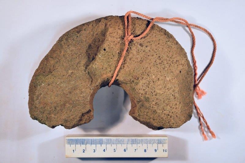 Fiskisleggjuhaus, brotinn. Appelsínugult snæri bundið um hann miðjan.