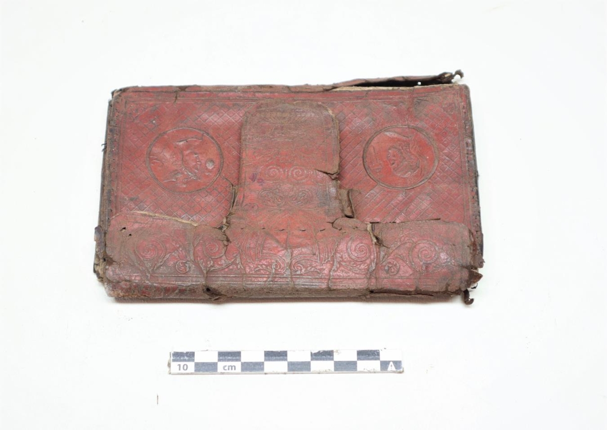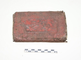 Seðlaveski úr rauðu skinni þrykkt, úthleypt. Innan í það hafa verið límd prentuð myndablöð með Notre-Dame kirkjunni og Sigurboganum í París og prentuð þvottarskrá á þýsku og frönsku. Virðist það fyrri hluta síðustu aldar. Í veskinu liggur upplitað kvæði Jón Thoroddsen Smalastúlkan, skrifað eftur Norðurfara (1848). – úr eigu Daða Davíðssonar, en virðist þó elda en frá hans tíð. Stærð: 17cm. x 11cm. x 1cm