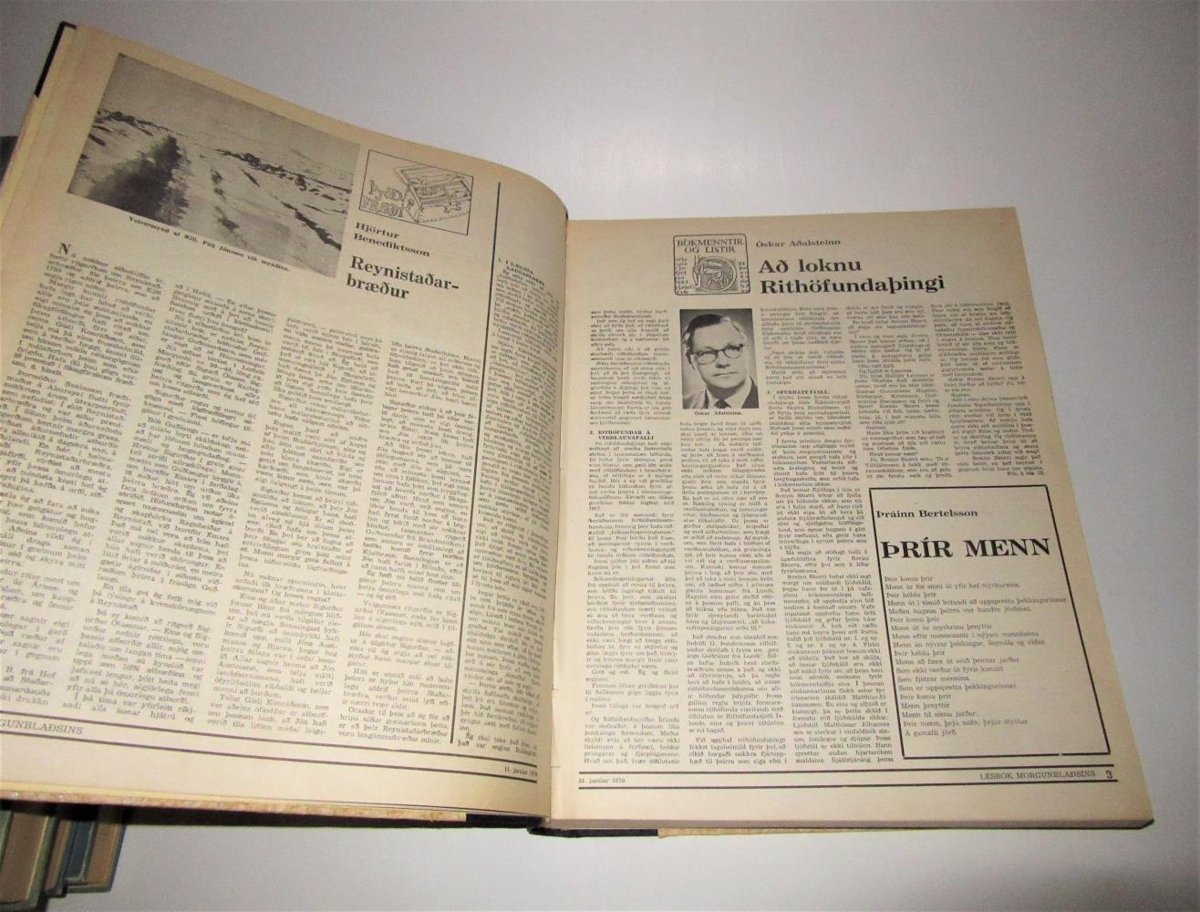 Innbundin Lesbók Morgunblaðsins, árg. 1970, gulbrúnyrjótt spjöld, svartur kjölur. Bundið inn af Pétri Teitssyni.