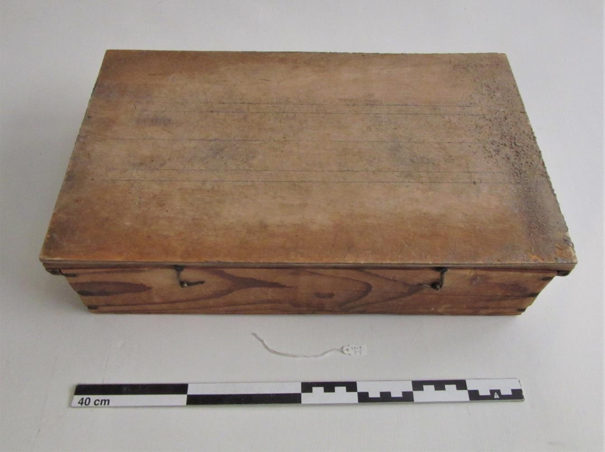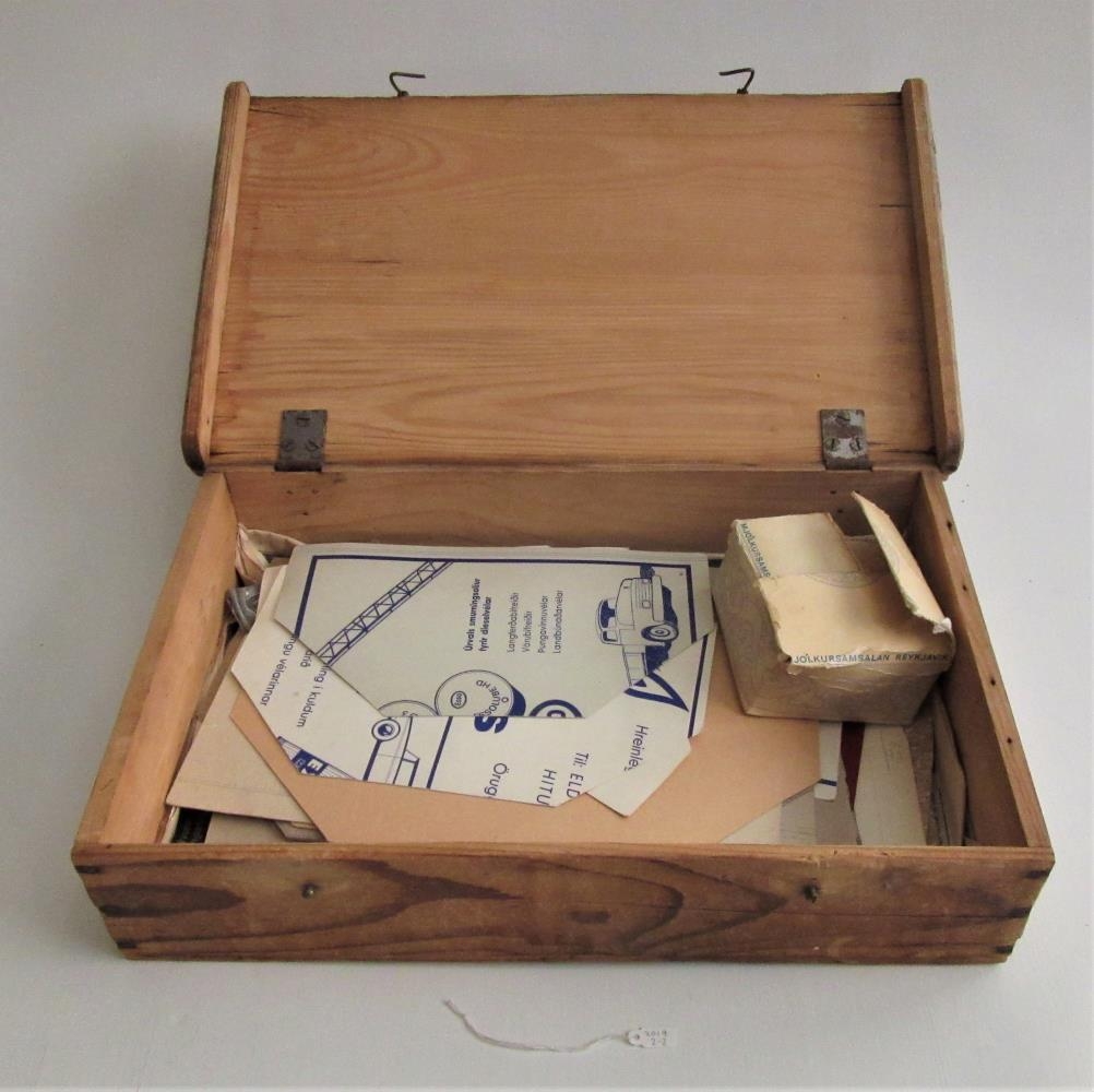 Trékassi fyrir bókband með bókbandsefniviði úr eigu Péturs Teitssonar.
