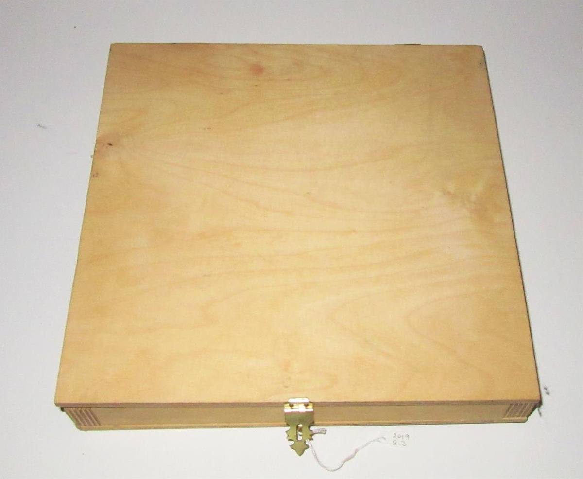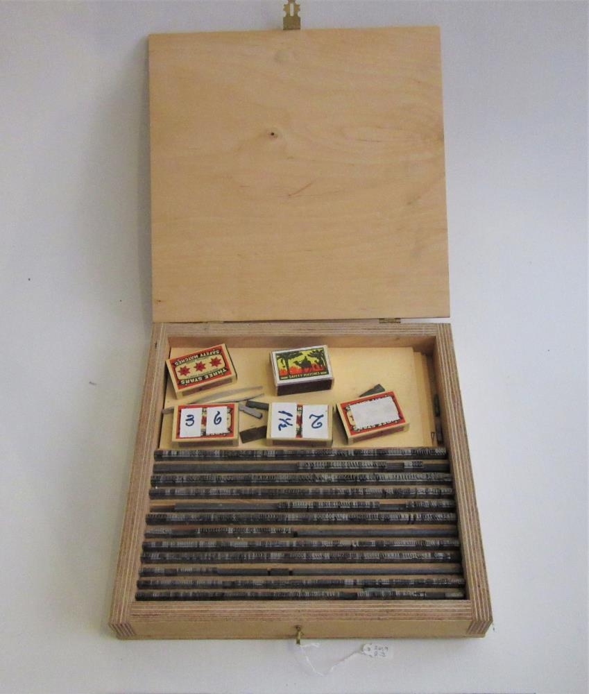 Leturkassi úr tré fyrir bókband, í honum eru prentstafir, ásamt eldspýtustokkum með prentstöfum og flísatöng til að ná stöfunum. Einnig pappír. Var í eigu Péturs Teitssonar.