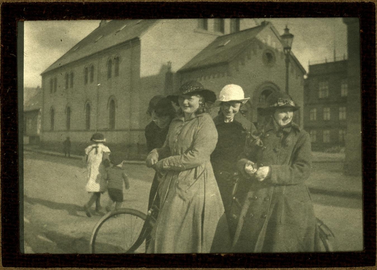 Fjórar konur með reiðhjól í forgrunni, klæddar í tísku þess tíma. Í baksýn er Dómkirkjan í Reykjavík.
