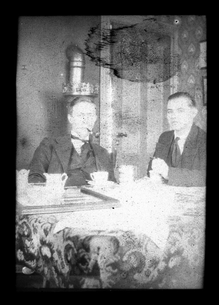 Tveir karlmenn sitja við borð, líklega Jón Þveræingur og Haraldur Johannessen aðalféhirðir í Landsbankanum.