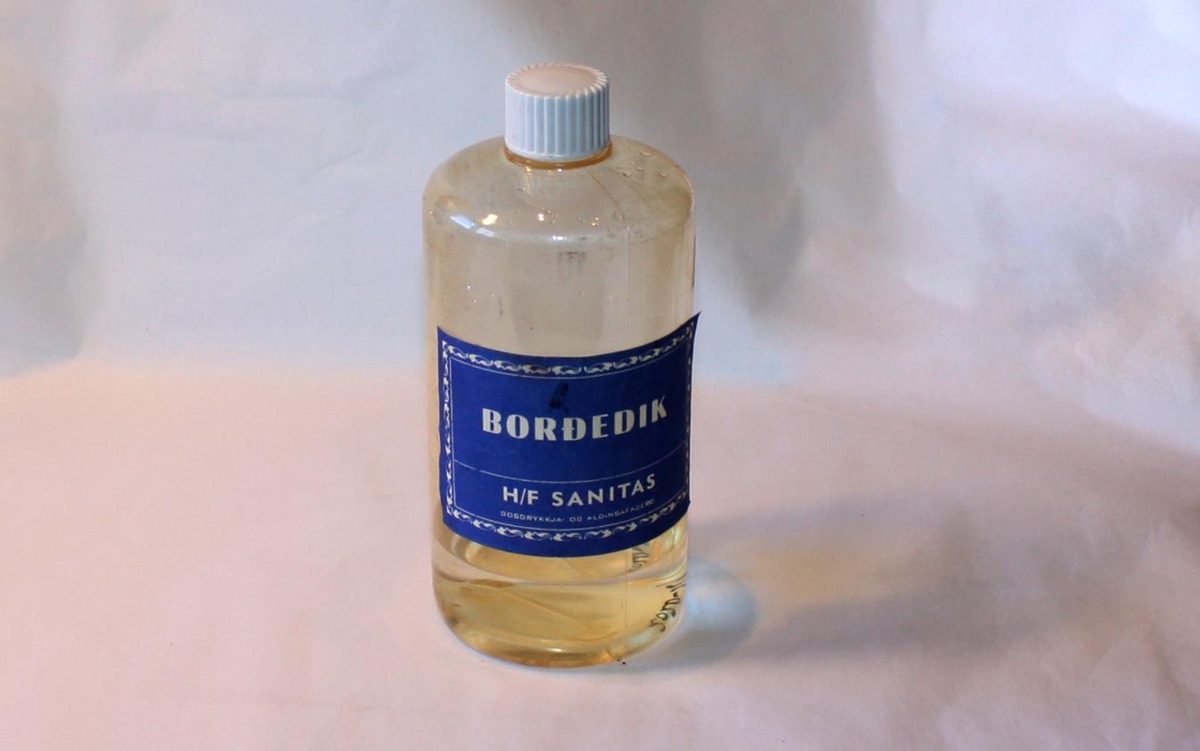 Plastbrúsi af Edik sem notað var til að blanda við umbra málingu. Þetta borðedik merkt h/f SANITAS og var keypt í Sláturfélagi Suðurlands á Akranesi og kostaði kr. 83-.