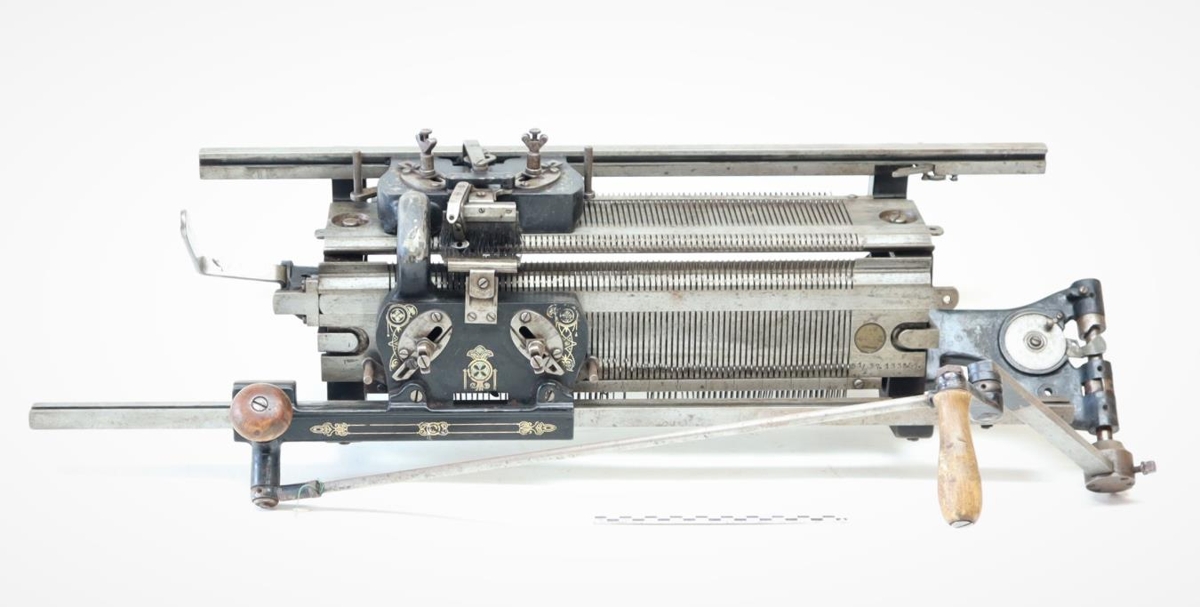 Prjónavél. Gefandi Svanborg Guðmundsdóttir frá Lækjarhvammi. Vélinni fylgja ýmsir aukahlutir.
