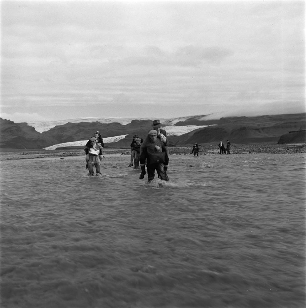 Vestur-Skaftafellssýsla. - Fólksburður yfir Jökulsá á Sólheimasandi. Maðurinn er Bárður Magnússon í Steinum og ef til vill Magnús Tómasson aftar. 1. Vaðið yfir Jökulsá (Klifandi?)