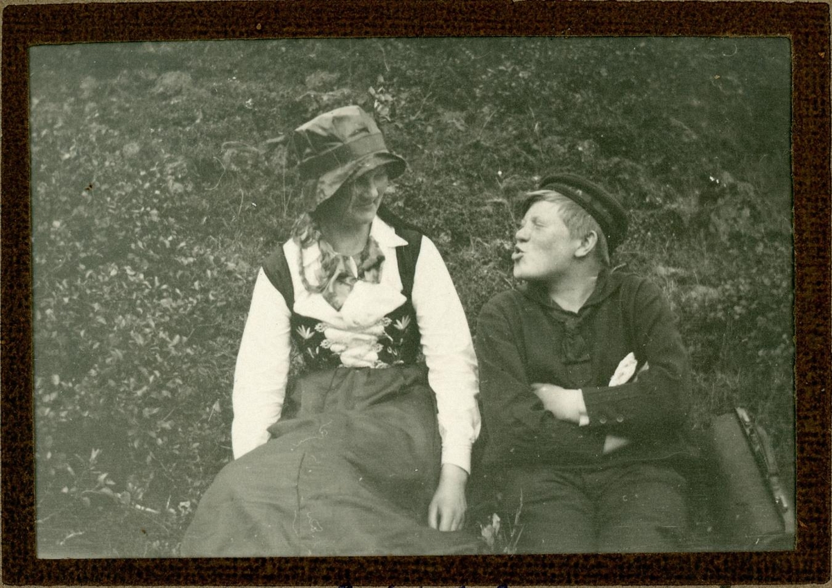 Kona og piltur sitja í lyngbrekku.
