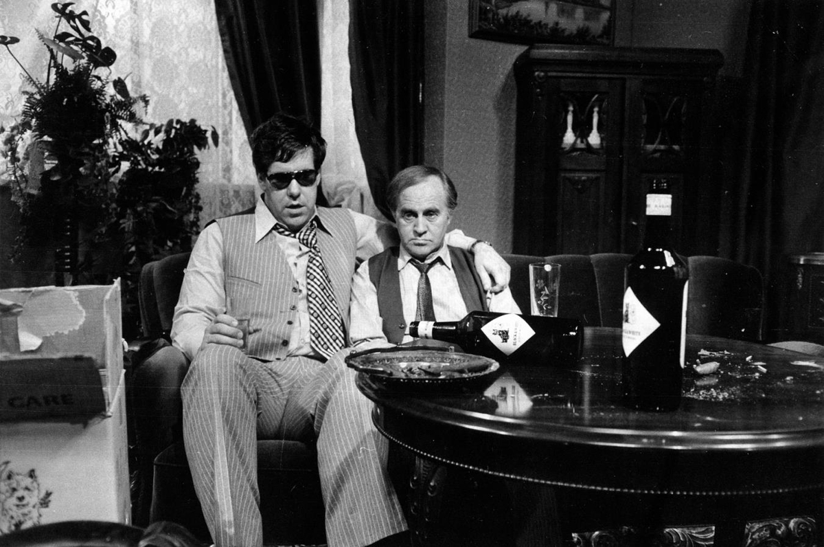Leikritið Veiðitúr í óbyggðum, eftir Halldór Laxness. Á myndinni eru Gísli Halldórsson, gjaldkerinn og Sveinbjörn Matthíasson, sonur útibússtjórans
