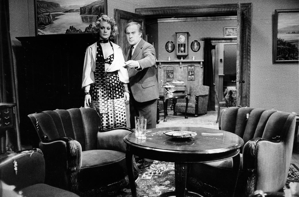 Leikritið Veiðitúr í óbyggðum, eftir Halldór Laxness. Á myndinni eru Gísli Halldórsson, gjaldkerinn og Saga Jónsdóttir, dóttirin.