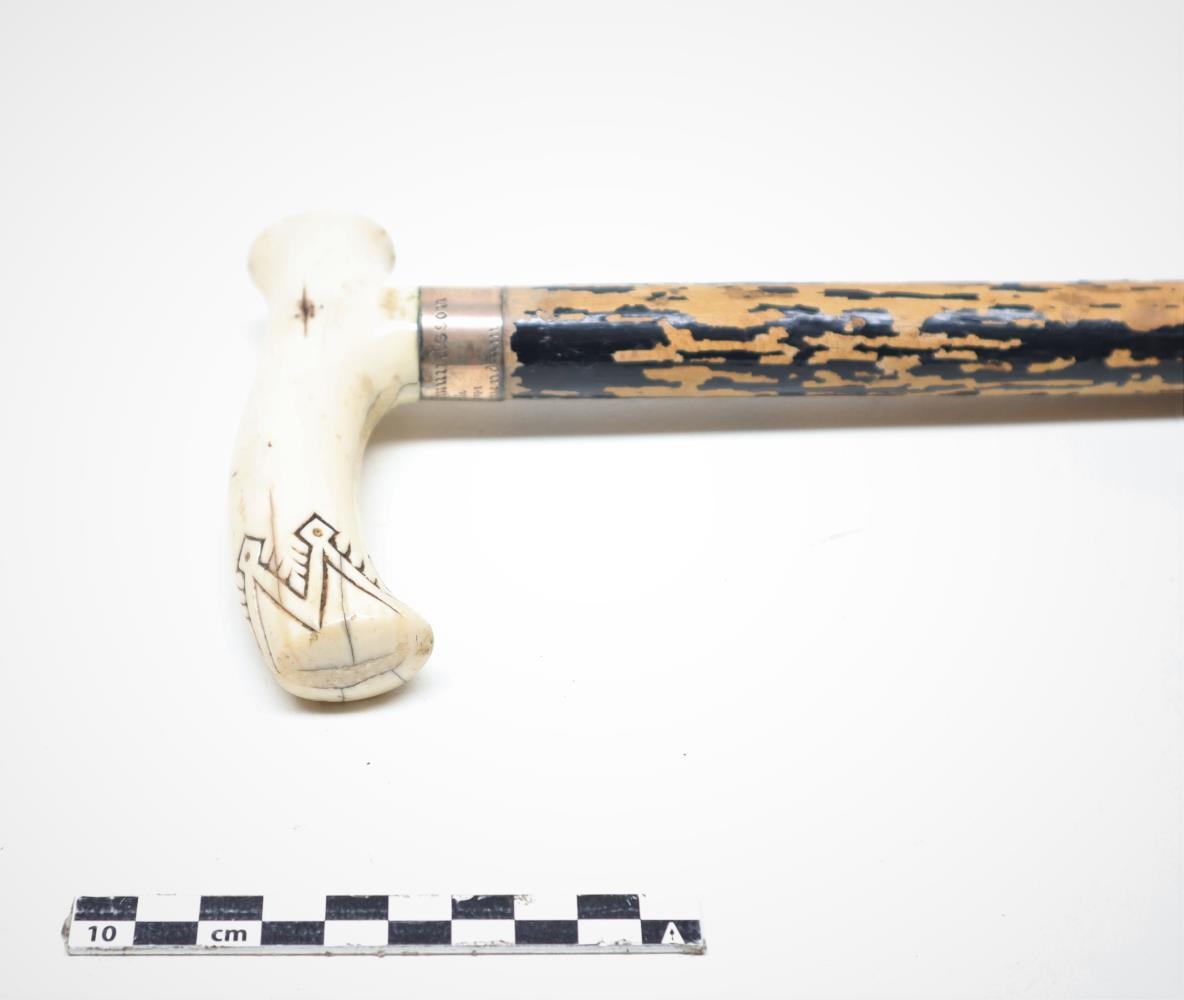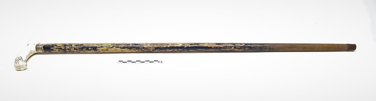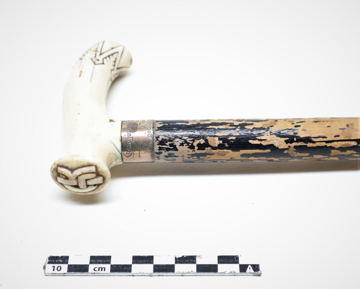 Göngustafur Guðjóns Kristmundssonar kennara frá Skeljavík í Steingrímsfirði. Gjöf frá gömlum nemendum. RJ. stendur á haldi sem mun vera Ríkharður Jónsson. Gefandi Guðrún Kr. Halldórsdóttir frá Víðivöllum í Staðardal í Steingrímsfirði. Útskurður á handfangi er eftir listamanninn Ríkarð Jónsson myndhöggvara.