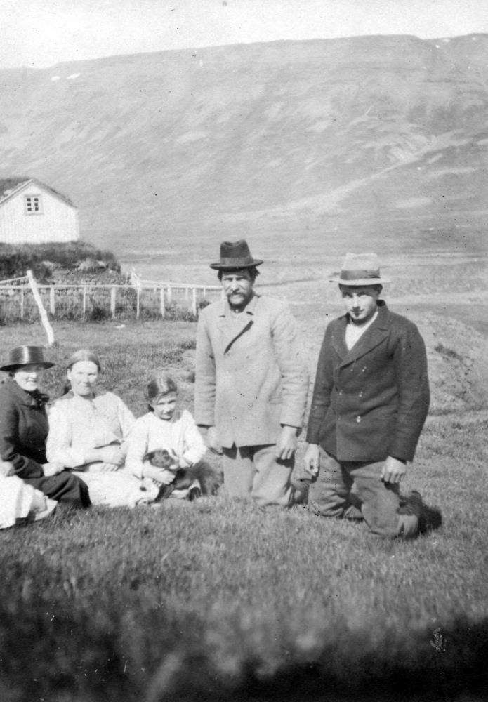 Lengst til vinstri Fanney Sveinsdóttir eða Svanfríður Sveinsdóttir, Guðrún Árnadóttir húsfreyja, Kamilla uppeldisdóttir þeirra hjóna, Jón Ólafsson, bóndi, Þorsteinn Ólafur Jónsson, sonur þeirra. Myndin er tekin um 1920.