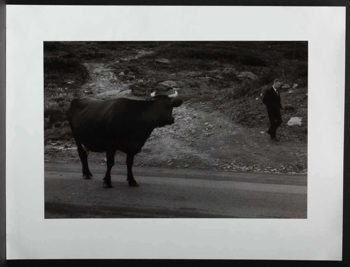 Í forgrunni stendur kýr á vegi og glápir á jakkaklæddann karlmann sem kemur gangandi niður malarslakka í baksýn.