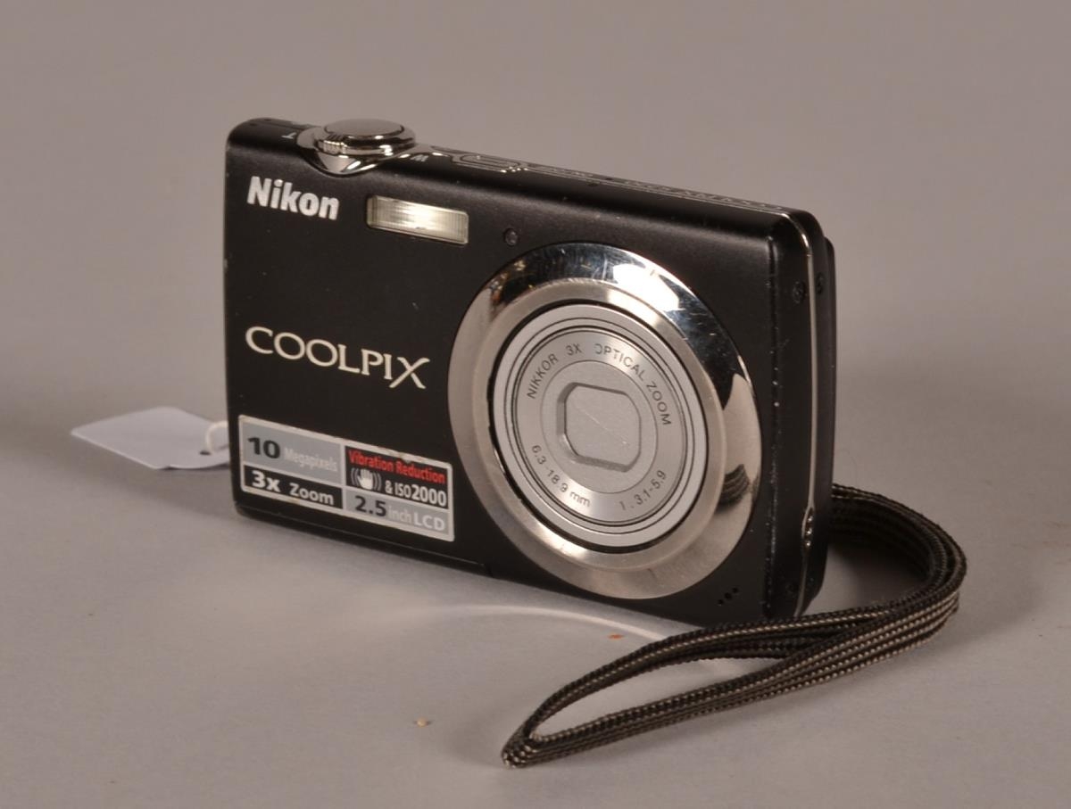 Lítil, svört og silfurlituð stafræn myndavél af gerðinni Nikon Coolpix S220. Myndavéli er með innbyggt minni.