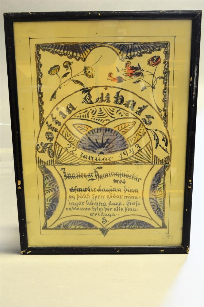 Innrammað afmæliskort Soffíu Túbals. Kom ásamt ógrynni af skjölum, þakkarbréfum og fleiri bréfum úr eigu Soffíu. Afhent ásamt R-8410 (tóbaksdós) af Herði Björgvinssyni eiginmanni Guðbjargar Karlottu Hjörleifsdóttur. Skrautskrifað og málað og svartur sandur límdur til skrauts. Á því stendur: Soffía Túbals 22. Janúar 1943. Innilegar hamingjuóskir með afmælisdaginn þinn og þökk fyrir góðar minningar liðinna daga. Gæfa og blessun fylgi þér allar þína ævidaga. S.