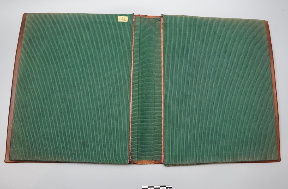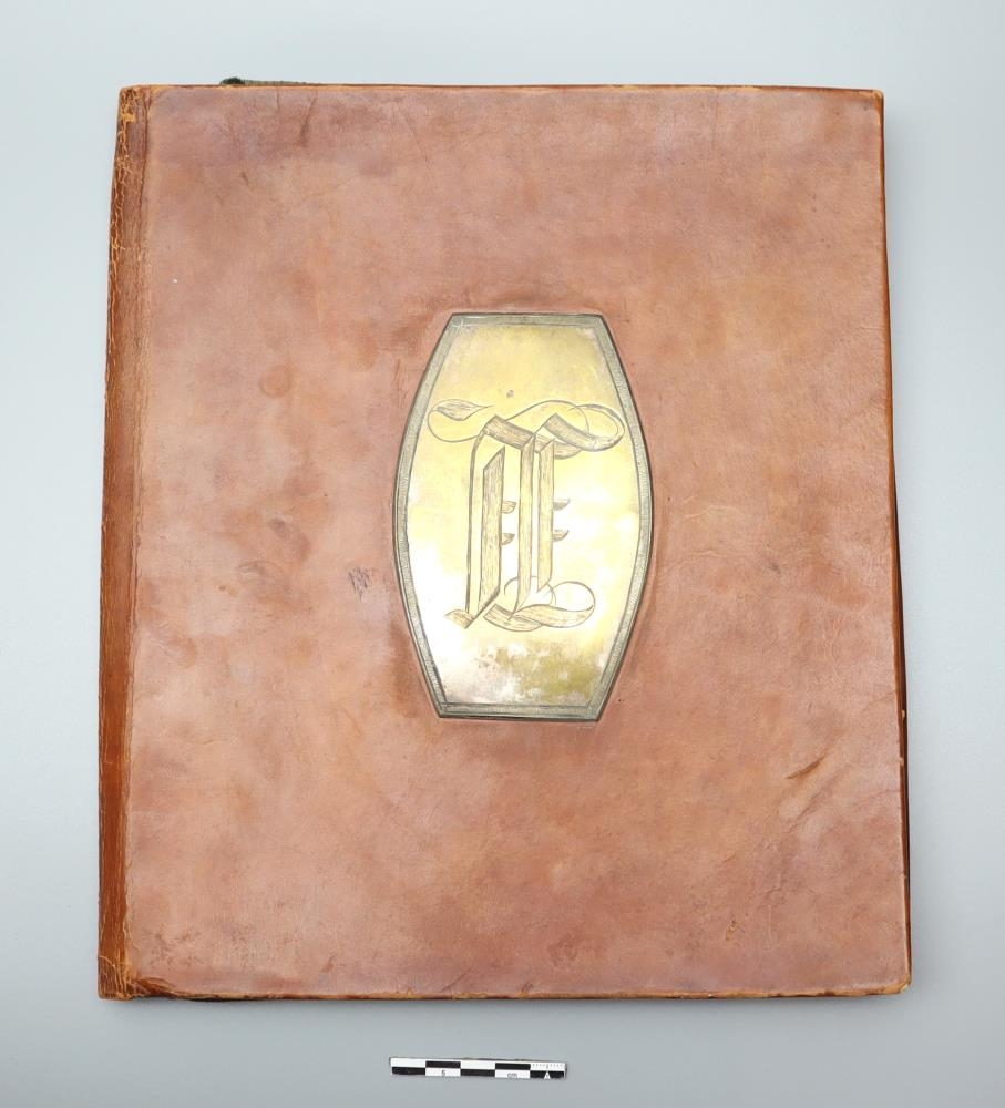 Leðurmappa 23 x 27 cm. á stærð og er hægt að brjóta hana saman eins og bók. Á framhliðinni er mikið upphleypt blómamunstur, en á afturhliðinni er skjöldur með J.L.,sennilega úr silfri. Að innan myndar rauðleitur pappi og grænt fóður vasana. Mappan er gerð af frú Lange handa manni hennar.