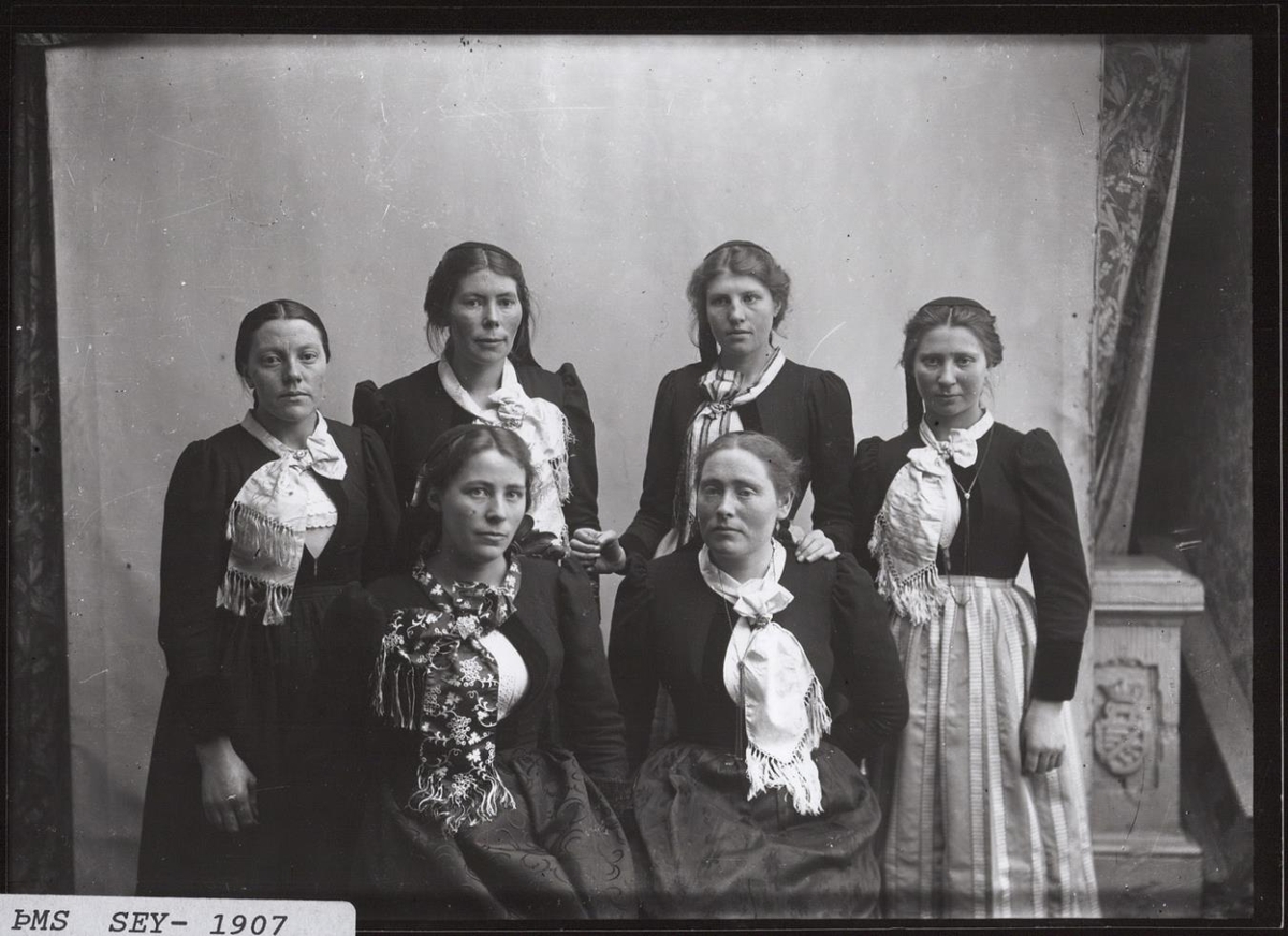 Hópmynd. 6 konur í peysufötum. „Vilborg Runólfsdóttir (1884 - 1965), fremri röð, lengst til vinstri.“ (JÖB 2020)